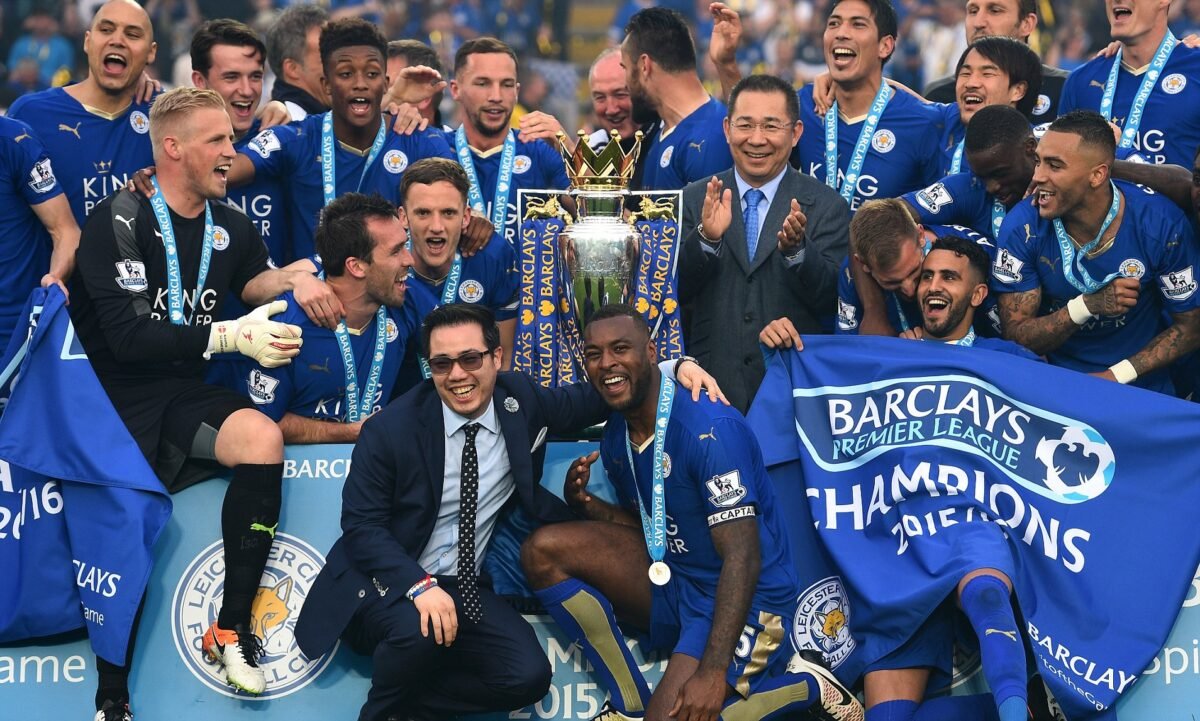 LEICESTER, ENGLAND – MAY 07: Captain Wes Morgan, owner Vichai Srivaddhanaprabha, his son Aiyawatt Srivaddhanaprabha and players celebrate the season champions with the Premier League Trophy after the Barclays Premier League match between Leicester City and Everton at The King Power Stadium on May 7, 2016 in Leicester, United Kingdom. (Photo by Shaun Botterill/Getty Images) Photo Source – Daily Mail UK